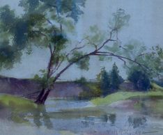 A section of Lynde Creek near Jeffreys Flats on the McGillivray lands in the green tones she loved to work in. Water-colour late 1890s, signed, Private Collection