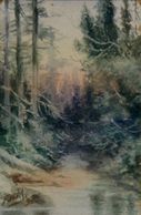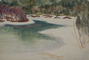 Ice almost covers the river in this unknown location, likely near Wakefield, Quebec, watercolour, unsigned, C - 1928, Private collection