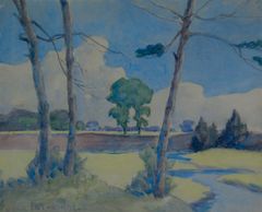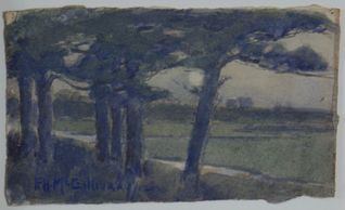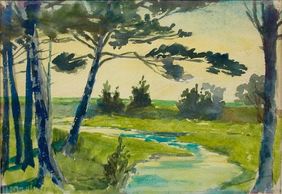 A closeup of the grove, creek behind on a grey day, watercolour, signed, 1905. Private Collection