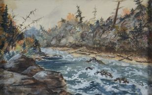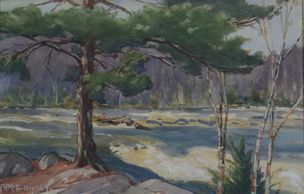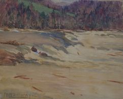 This painting of the Gatineau River near Chelsea Quebec can't be seen today due to changes in the river because of Hydru facilities, watercolour, signed, no date, Private Collection