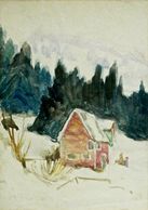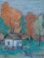 A small drawing of a cabin in the fall, likely near Wakefield Quebec, this pretty work a pastel, signed, with no date, Private Collection