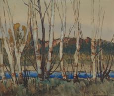 A river peeks out from behind a stand of birch trees, watercolour, signed, 1926, Private Collection