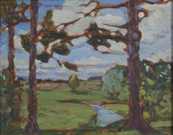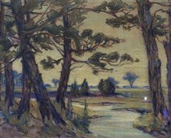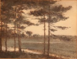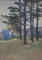 This time we look west through the pine grove at twilight, in that thickly painted style she brought back from Europe, oil, signed C -1915