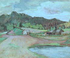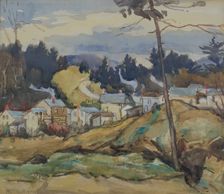 This picturesque painting is a stunning depiction of the typical farms in the Gatineau valley, watercolour and gouache, signed, C - 1928, permanent collection Royal Ontario Museum