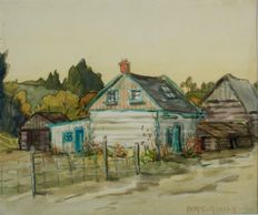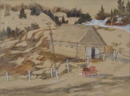 Typical of the log barns and cabins that are scattered among the hills of the Gatineau Valley, watercolour and gouache, signed verso, 1930, Private Collection