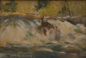 One of two versions of these falls where the ferry ran before the hydro dam was built there.this signed, watercolour was done in 1928, and is in a private collection