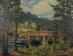 This is a later painting, one of her largest oils of the wooden bridge at Ferrelton on the Gatineau river, it has been replaced by a steel version, A magnificent oil, signed and believed to be C -1930, in a private collection