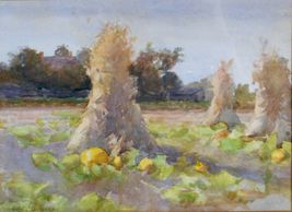 A scene in the field to the west of Inverlynn painted at the time when O'Brien visited and painted his "Inverlynn Harvest", watercolour fall 1898 Signed, Private Collection