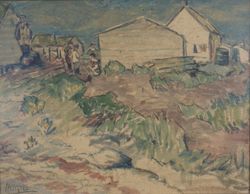 A different part of the shoreline, showing how the fishermen lived in St. Anthony's, watercolour, signed. C - 1923, Grenfell House Museum, St. Anthony, N.F.L.D.