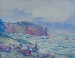 Fishermen on shore working with Perce Rock as a backdrop, watercolour, signed, C - 1918, Private Collection