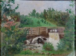 Somewhere near Whitby Ontario or in the Gatineau valley there existed a dam like this? We haven't found it. An early painting signed in pencil, oil, undated, Private Collection