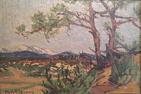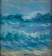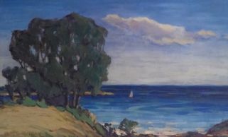 Invited to California by friends she visits, Santa Barbara, La Jolla, Catalina Island, Sonoma and San Fransisco. This oil from 1921 is unsigned, private collection