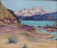 Florence presents the contrast of the cool snow covered mountains and the hot dry dessert she sees in this California scene, oil 1920, signed Private Collection