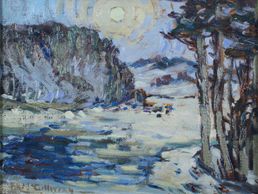 An image from the 1918/1919 winter trip that started in California and ended in Alaskan, likely created at home in the Ottawa studio, this spectacular oil , signed, C - 1920 reminds us of the Algonquin school style