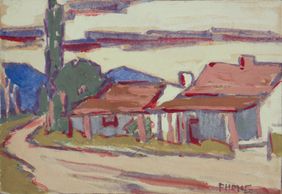 Somewhere near Skagway Alaska she found this scene, reminiscent of her friends in the Algonquin schools work. oil on board, signed, 1923, private collection