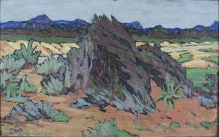 Looking back inland at an unknown location we see desert with a mountain background, likely from the studio. This oil, signed, 1920, Private Collection