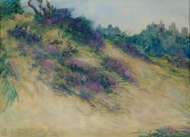 Florence captures the floral dunes with a backdrop of a city skyline, likely her first of the sand dune series. Watercolour, signed, 1918, Private Collection