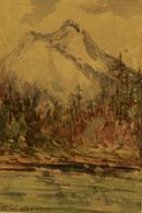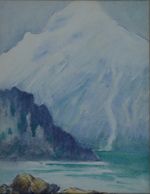 An unknown lake at the base of a snow covered mountain from her west coast trip, watercolour, signed, 1920, Private Collection