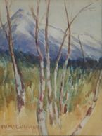 Another mountain view seen through a clump of birch trees in Alaska, watercolour, signed, 1920, Private Collection