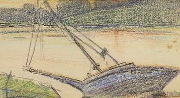 Somewhere near Stonington Connecticut this beached boat captured her attention, coloured pencil, signed, C - 1918, Private Collection