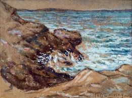 The odd shaped rock and ominous sky must have caught Florence's interest in this shoreline scene, watercolour signed with ARCA verso, 1924, Private Collection