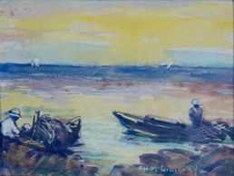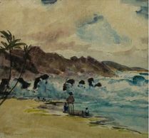 A warm charming scene of a beach we do not know, suspected to be Jamaica, oil, signed, C -1925, Private Collection.