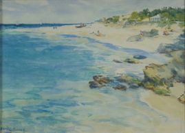Rich white sand covers this tranquil beach in Barbados, watercolour and gouache, signed, 1923, Private Collection.