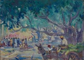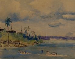 One of the numerous scenes with no precise locations, the light in this painting gives us a sense of the warmth to the tropical day depicted in this painting. A watercolour, signed, C - 1920s, Private Collection