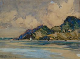 Sailboats pass close to the island in this charming picturesque view, watercolour, signed, 1920, Private Collection